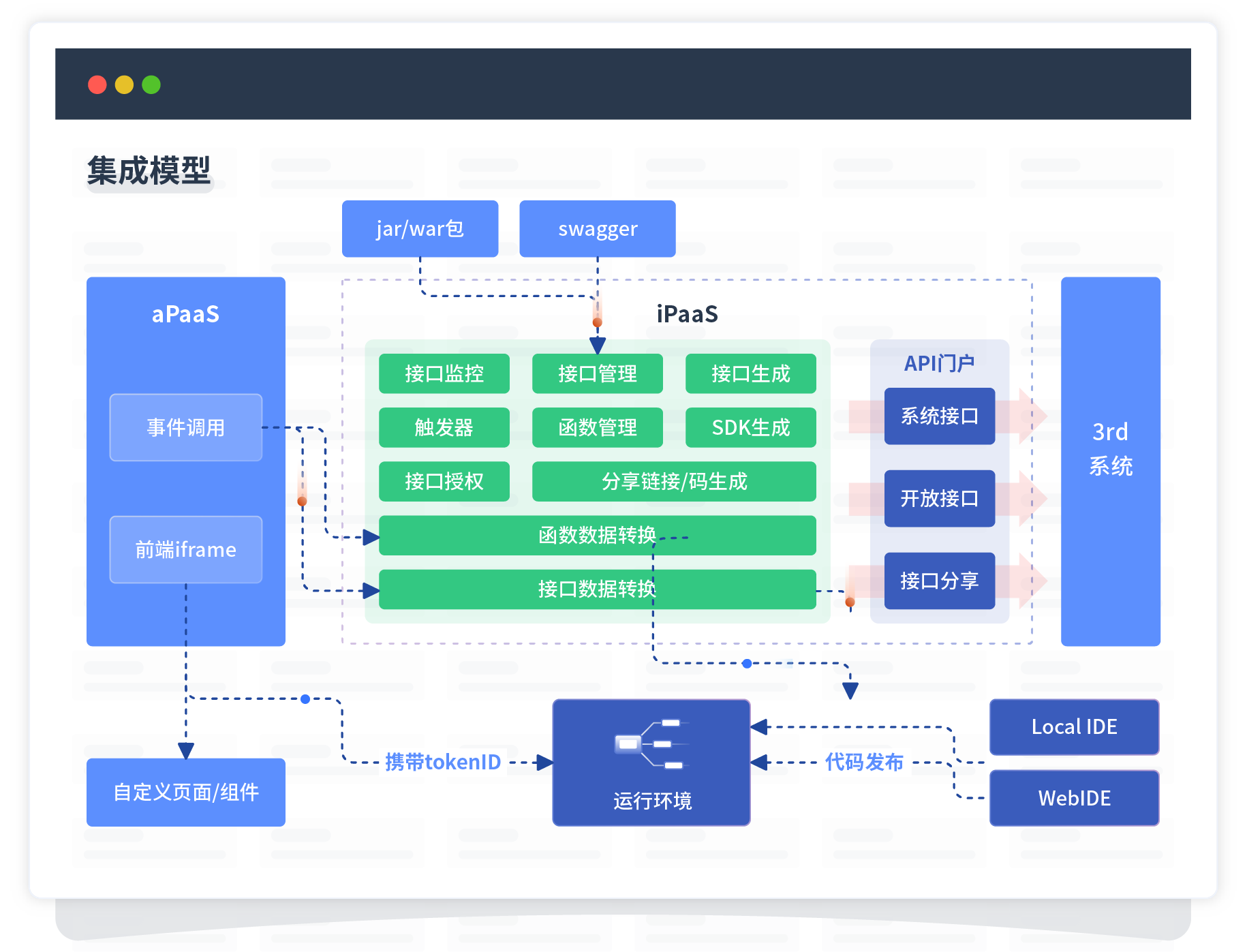 集成模型包括平台本身前、、、、、、、、、后端能力的扩展,,,,,,,,也支持通过API门户和第三方系统进行交互。。。。。。